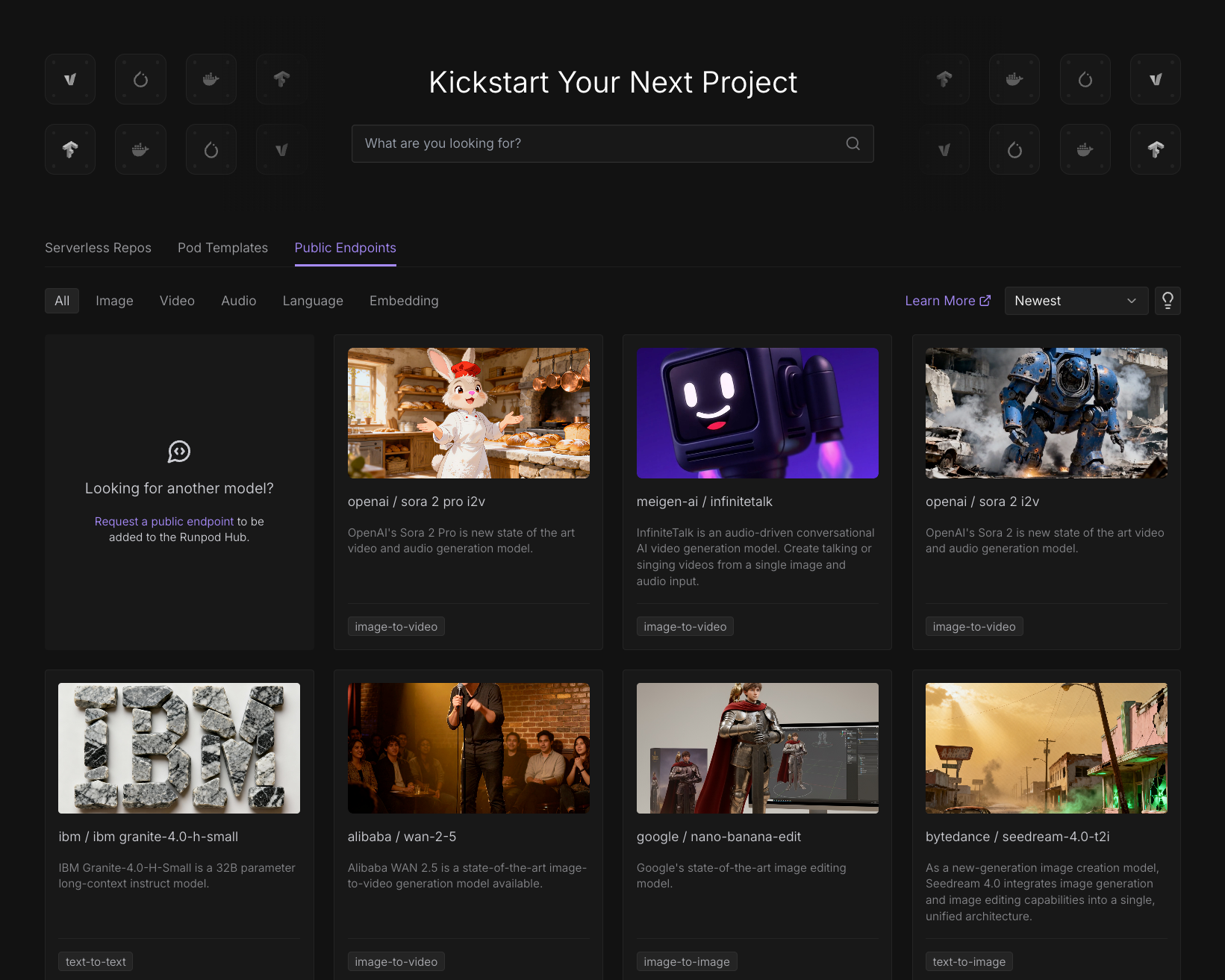 Public Endpoints are ideal when you want to use popular AI models without managing infrastructure. Choose Public Endpoints when:- You need quick access to standard models. Generate images with Flux, transcribe audio with Whisper, or chat with Qwen without setup.